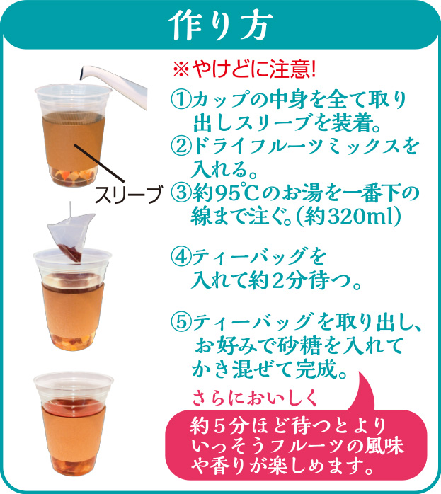 ティーバッグを取り出して5分ほど経つと、フルーツのやさしい甘みがじっくり出てきて、より一層美味しくお召し上がりいただけます。ドライフルーツはぷるんとしていて食感も良いので、紅茶と一緒に果肉もぜひお召し上がりください。