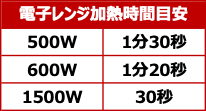 ●加熱時間は、ご使用の機種や保存温度により異なる場合があります。目安の加熱時間でも冷たい場合は、10秒ずつ再加熱してください。