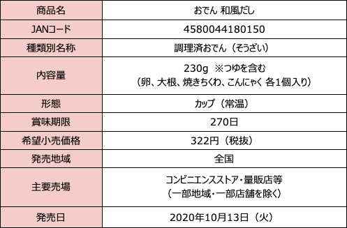 株式会社トーヨーコーポレーション(本社:東京都渋谷区、代表取締役社長:熊谷聡)は、電子レンジで温めて手軽に楽しめるカップ入りの「おでん 和風だし」を、2020年10月13日(火)より一部CVS店舗等で発売いたします。