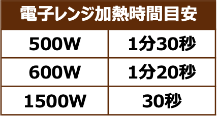 ●加熱時間は、ご使用の機種や保存温度により異なる場合があります。目安の加熱時間でも冷たい場合は、10秒ずつ再加熱してください。