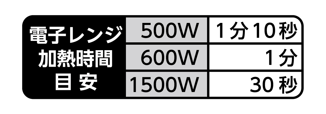 ●加熱時間は、ご使用の機種や保存温度により異なる場合があります。目安の加熱時間でも冷たい場合は、10秒ずつ再加熱してください。