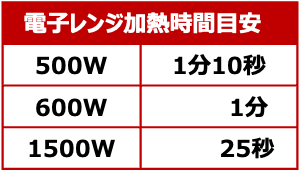 ●加熱時間は、ご使用の機種や保存温度により異なる場合があります。目安の加熱時間でも冷たい場合は、様子を見ながら少しずつ加熱してください。