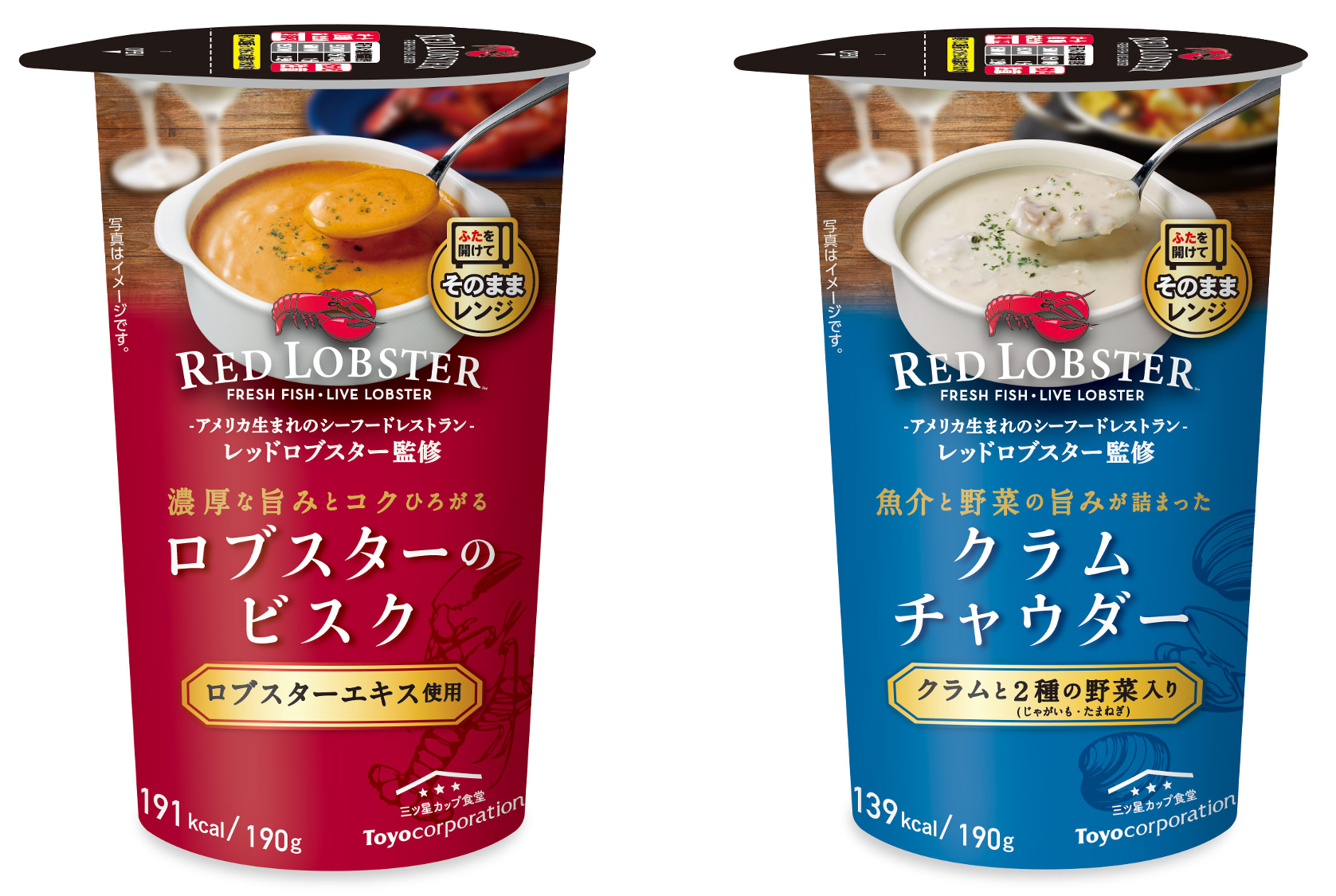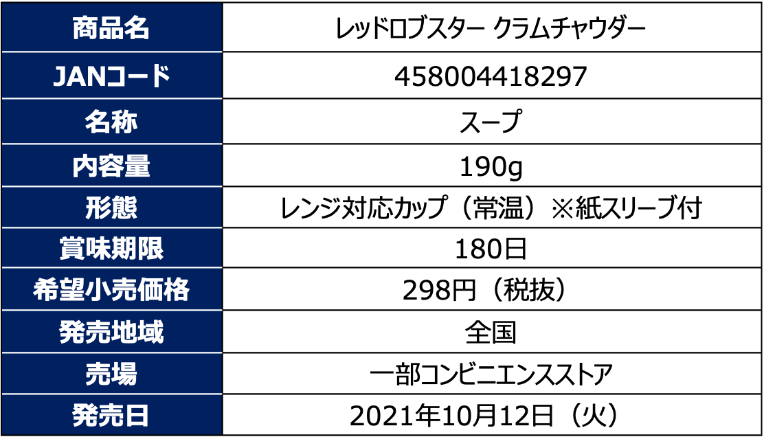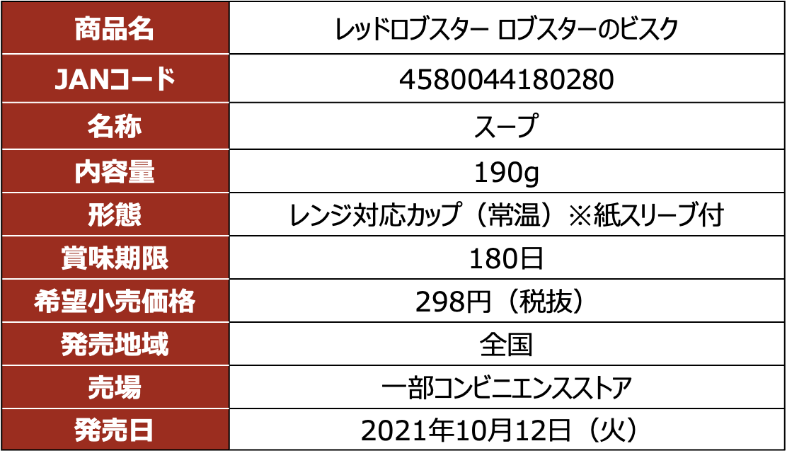 株式会社トーヨーコーポレーション(本社:東京都渋谷区、代表取締役社長:熊谷聡)は、レッドロブスタージャパン株式会社(本社:東京都渋谷区、代表取締役:大塚啓)とのコラボレーション商品として『レッドロブスター ロブスターのビスク』『レッドロブスター クラムチャウダー』の2品を、2021年10月12日(火)より一部コンビニエンスストアにて発売いたします。