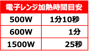 ●加熱時間は、ご使用の機種や保存温度により異なる場合があります。目安の加熱時間でも冷たい場合は、様子を見ながら少しずつ加熱してください。
