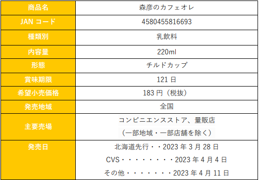 トーヨービバレッジ株式会社(本社:東京都渋谷区、代表取締役社長:熊谷聡)は、株式会社アトリエ・モリヒコ(本社:北海道札幌市、代表取締役:市川草介)監修の『森彦のカフェオレ』を、2023年3月28日(火)より北海道先行で発売、2023年4月4日(火)より全国のコンビニエンスストア、2023年4月11日(火)よりその他量販店等で順次発売いたします。