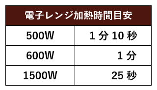 ●加熱時間は、ご使用の機種や保存温度により異なる場合があります。目安の加熱時間でも冷たい場合は、様子を見ながら少しずつ加熱してください。