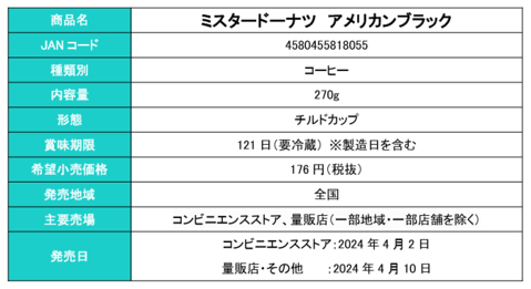 トーヨービバレッジ株式会社(本社:東京都渋谷区、代表取締役社長:熊谷聡)は、株式会社ダスキン(本社:大阪府吹田市、代表取締役社長:大久保 裕行)監修の『ミスタードーナツ アメリカンブラック』を、2024年4月2日(火)より全国のコンビニエンスストア、2024年4月10日(水)よりその他量販店等で順次発売いたします(一部地域・一部店舗を除く)。