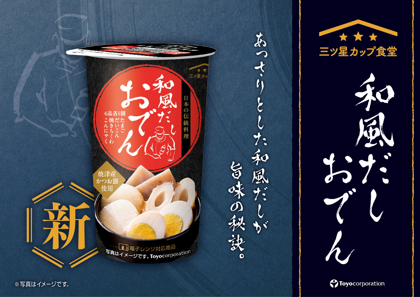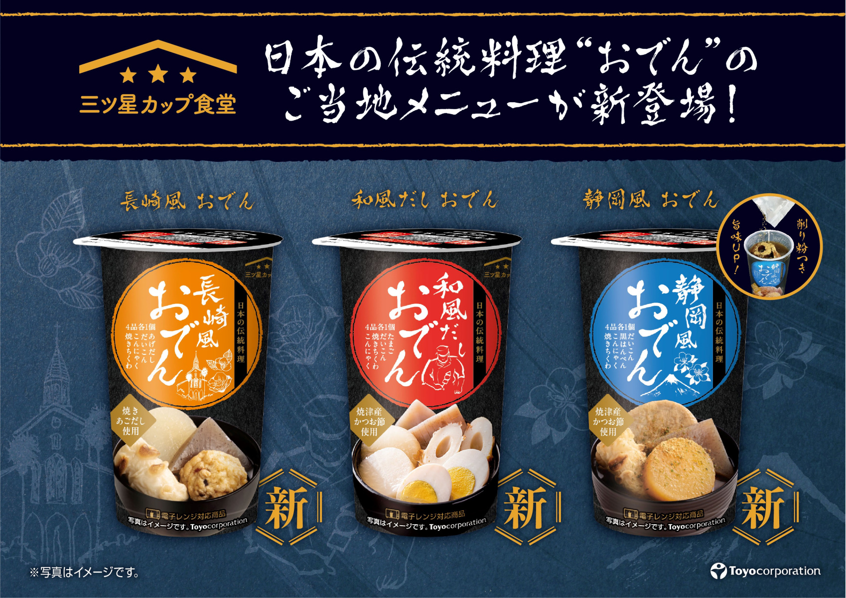 株式会社トーヨーコーポレーション(本社:東京都渋谷区、代表取締役社長:熊谷聡)は、電子レンジで温めて手軽に楽しめるカップ食品『和風だしおでん』、『長崎風おでん』、『静岡風おでん』を2024年9月24日(火)より全国のコンビニエンスストア・量販店等で発売いたします。